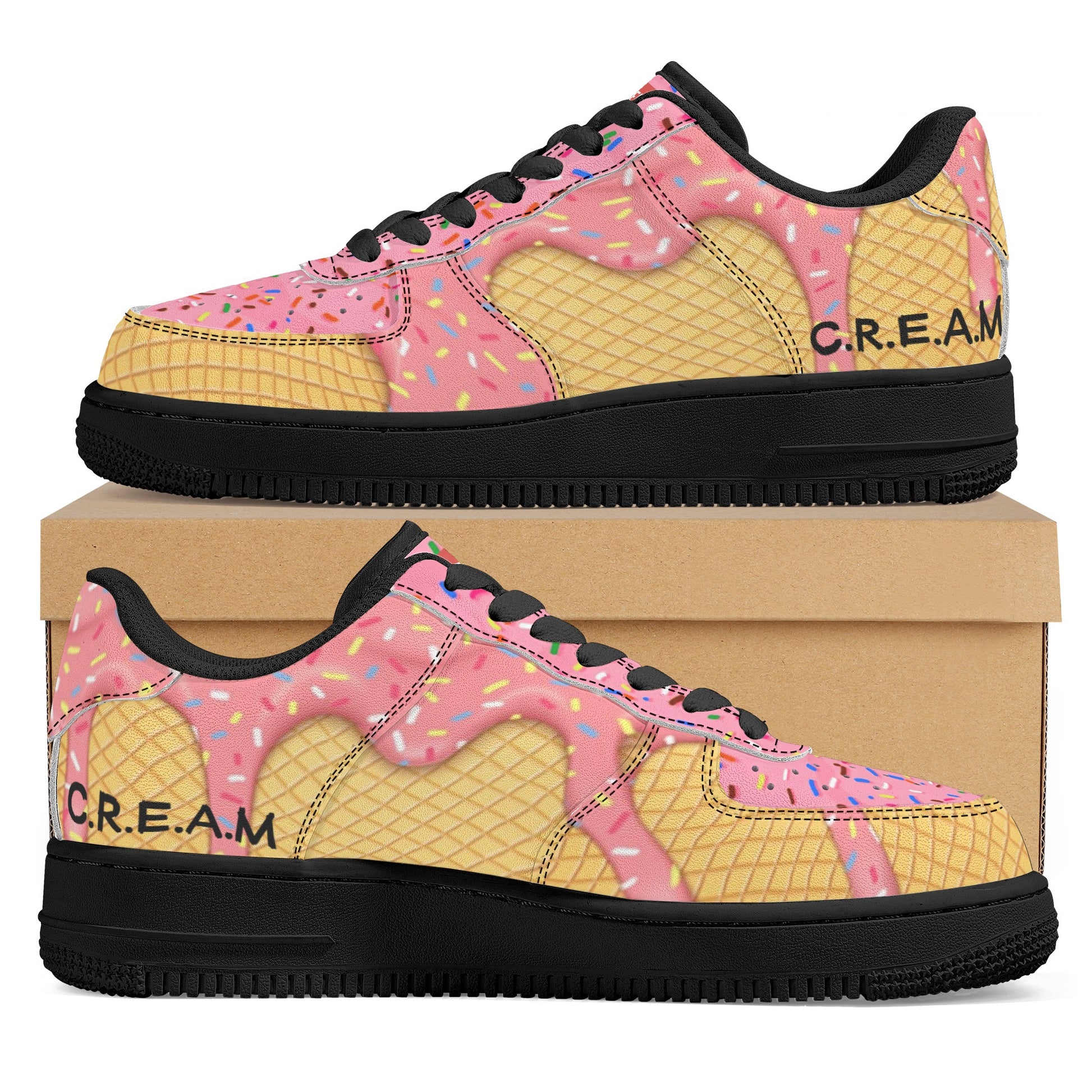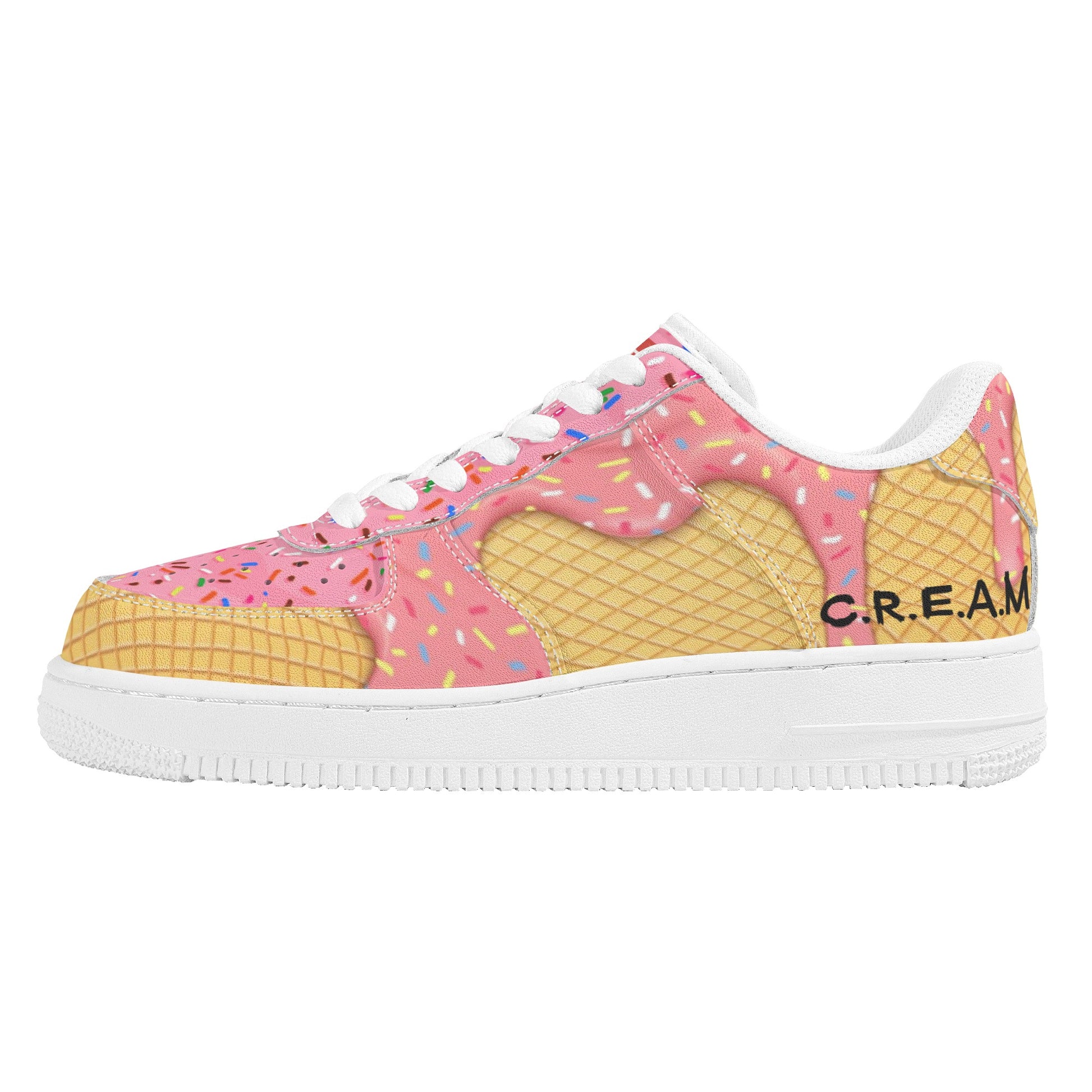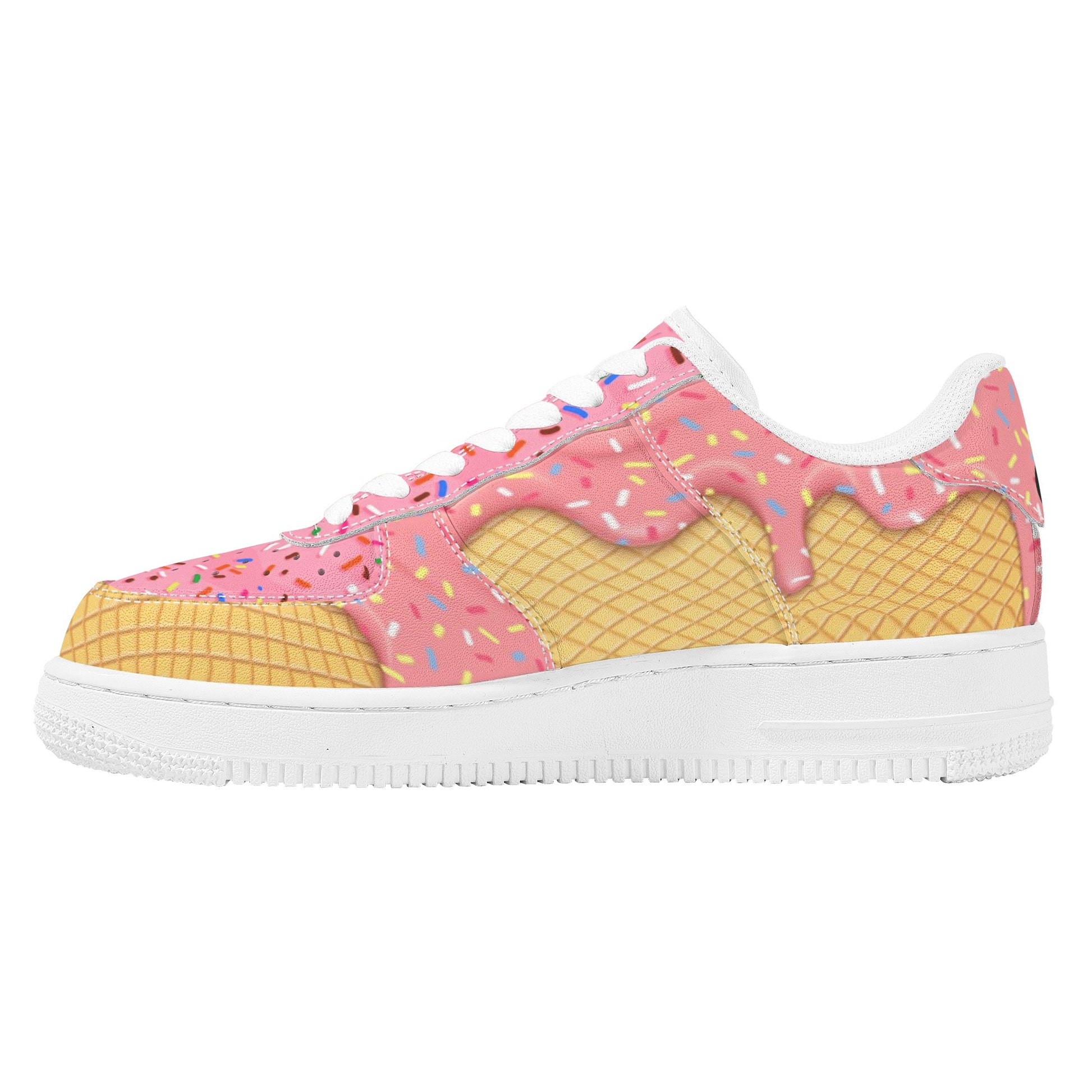 A low top basketball shoe decorated with Pink ice-cream with sprinkles followed by a waffle cone body.